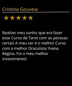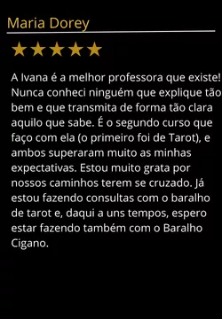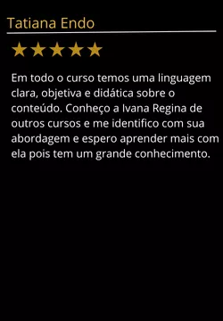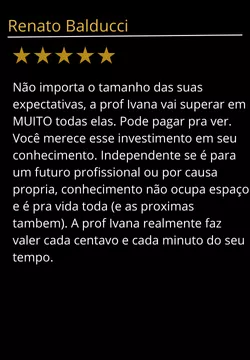 "Não importa o tamanho das suas expectativas, a prof. Ivana vai superar em MUITO todas elas. Pode pagar pra ver. Você merece esse investimento em seu conhecimento. Independente se é para um futuro profissional ou por causa propria, conhecimento não ocupa espaço e é pra vida toda (e as proximas também). A prof. Ivana realmente faz valer cada centavo e cada minuto do seu tempo."